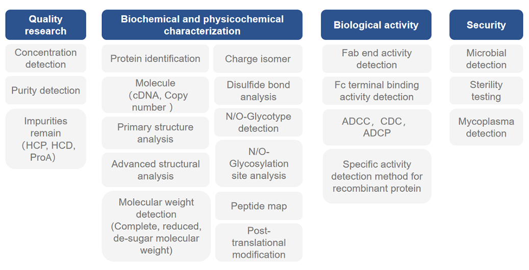 The analytical assay development team provides complete analytical methodology development and holds extensive experiences in analyzing monoclonal antibodies, bispecific antibodies and recombinant proteins. We can offer the bioanalytical assay development and testing package required for NMPA/ EMA/FDA IND/BLA submission covering the following: